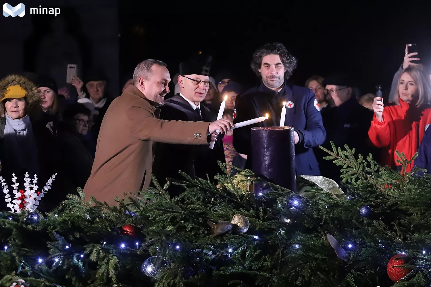 A szentbeszéd után sor került az ünnepélyes, közös gyertyagyújtásra. Az első adventi gyertyát Pásztor Dániel református püspök, Szopkó Tibor alpolgármester és Grubert Roland, a Magyar Vöröskereszt Borsod-Abaúj-Zemplén Megyei Szervezete vezetője gyújtotta meg, nagyszámú miskolci lakos körgyűrűjében.