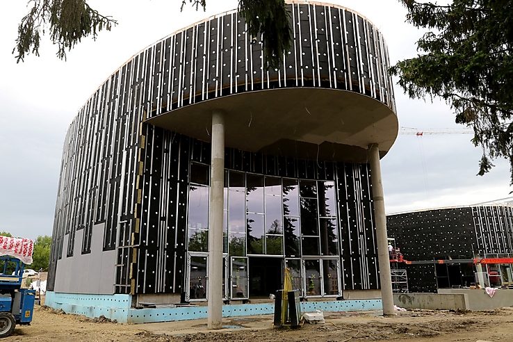 Bent viszont hónapok óta gőzerővel dolgoznak. A fogadóépületet most még a fekete szigetelés borítja, hamarosan megkapja azonban a modern, szürke burkolatot.