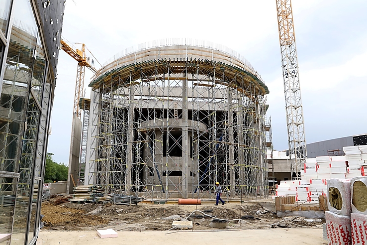 De már azon a hídon is az utolsó munkákat végzik, ami a most épülő komplexumot köti össze az első ütemmel, vagyis a már működő résszel. A fürdő öt épülete közül négy szerkezete már elkészült.